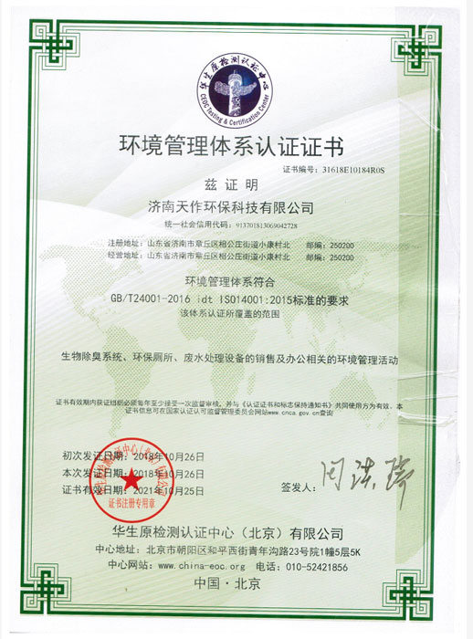 环境管理体系认证证书