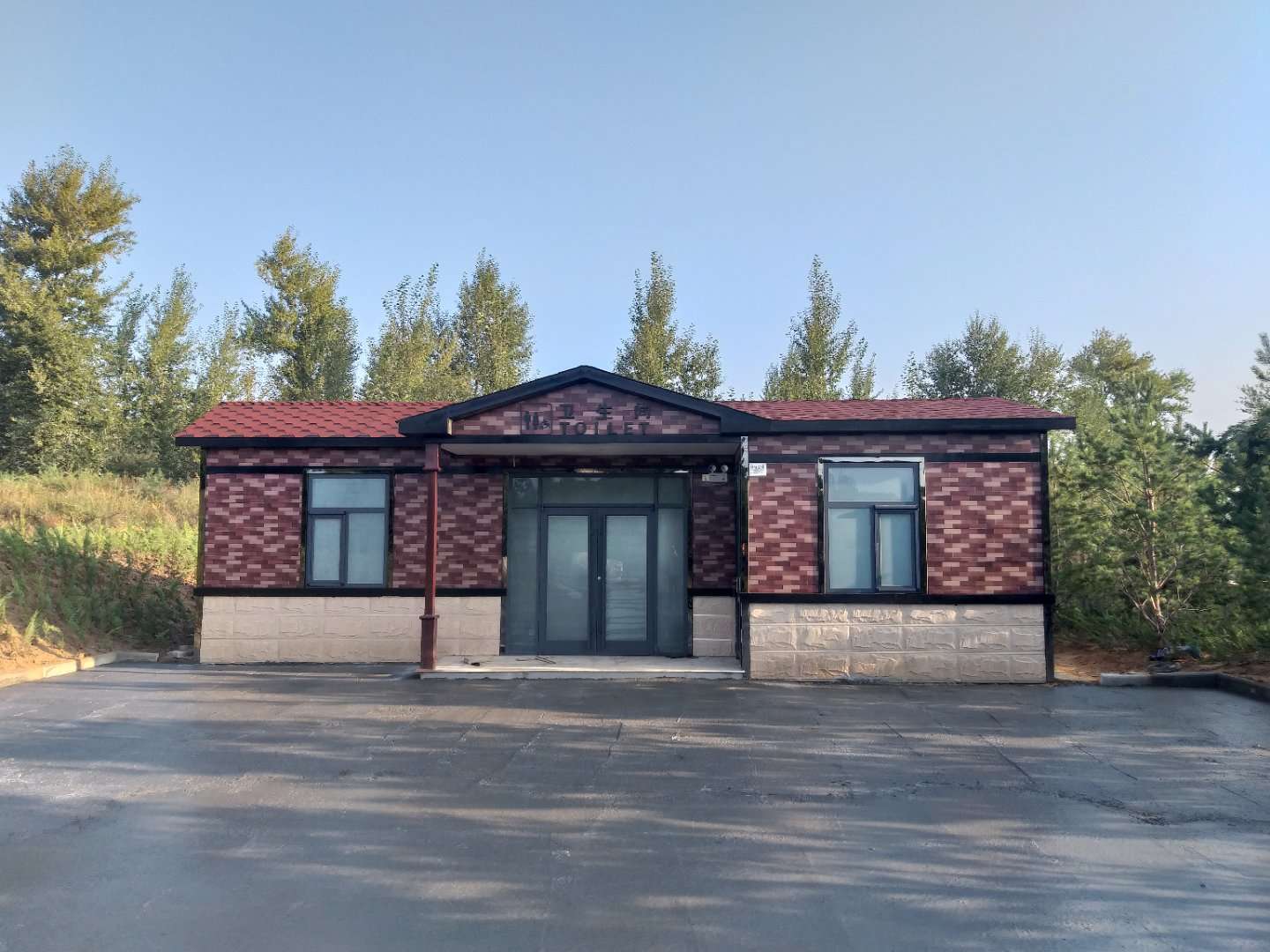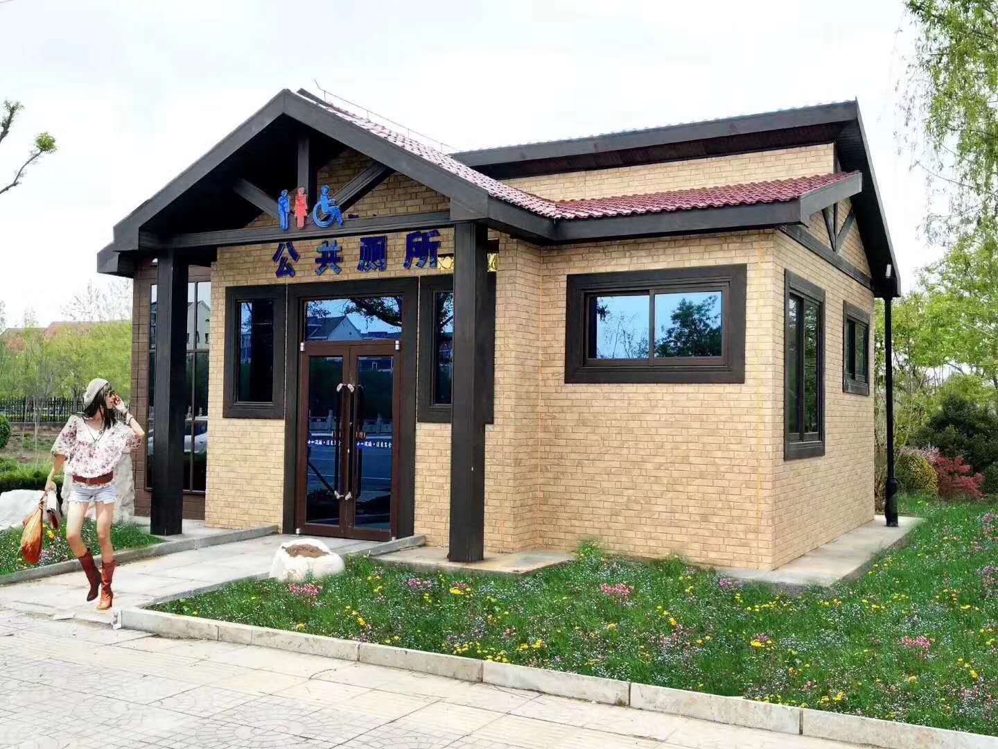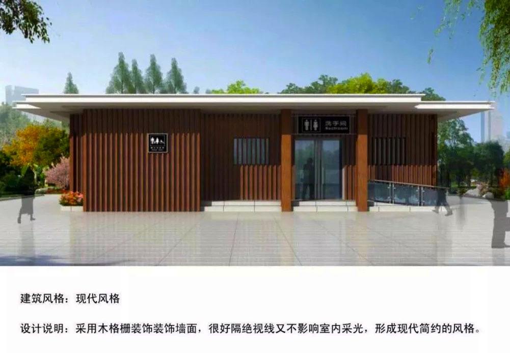 厕所室内外装饰均采用绿色环保建材。(铝塑板、PVC型材板),外观造型美观大方,线条流畅,能体现现代气息,与现代城市景观相协调。